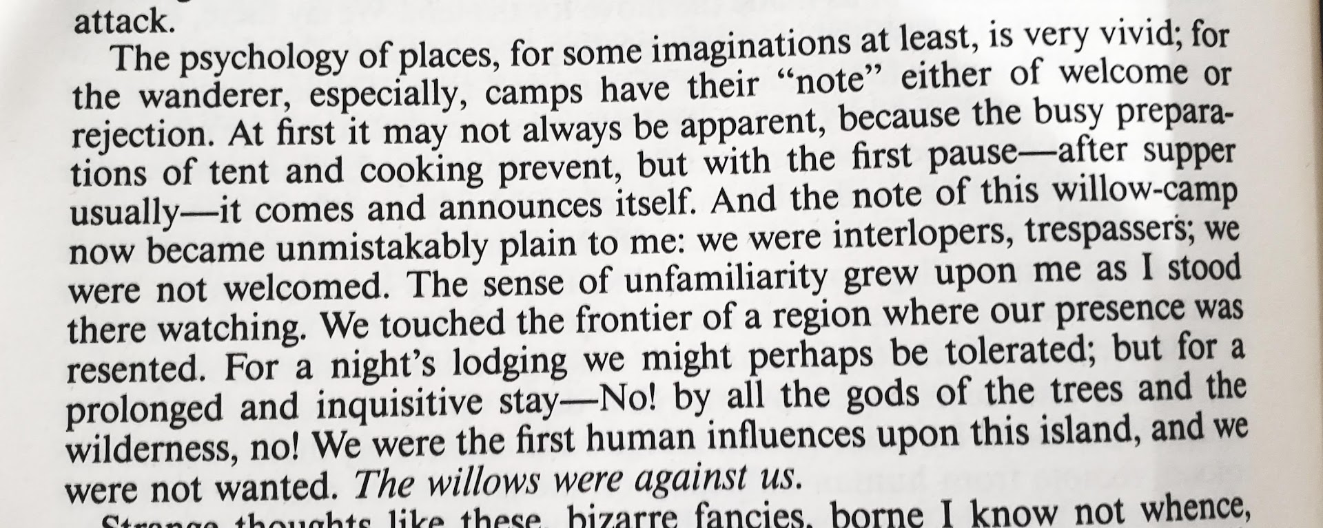 - “The Willows” by Algernon Blackwood – This is a masterpiece of a horror novella by the man H.P. Lovecraft considered the best writer of weird fiction. It blends horror with science fiction elements, similar to “The Colour Out of Space,” where nature itself provides the terror. In this case, it is willows that seem to be conscious and have malicious intent toward humans. The story follows two men on a river canoe trip deep in the wilderness of Europe, and it is the extreme isolation in nature that causes the horror. It’s not entirely clear if the willows are actually supernatural, or if the extreme isolation in nature caused their insanity. This is the story M. Night Shyamalan’s The Happening wishes it was.