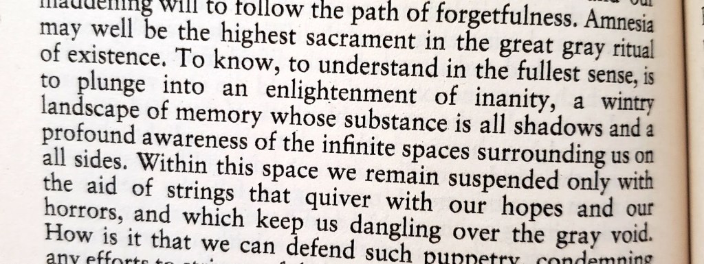 I had sky-high expectations for this collection of short stories after reading Ligotti’s other collections last year. I would rank it below Songs of a Dead Dreamer and Grimscribe but above My Work is Not Yet Done. Thomas Ligotti is one of those rare literary masters whose lesser work is better than the best of most other writers. There were no-doubt moments of brilliance. I was slightly worried at first because I didn’t enjoy the first few stories, but the latter half of the book was much better. It’s broken into three sections: Derangements, Deformations, and The Damaged and the Diseased. The final section was by far the best. They involve grotesque art and artists, including the titular story.