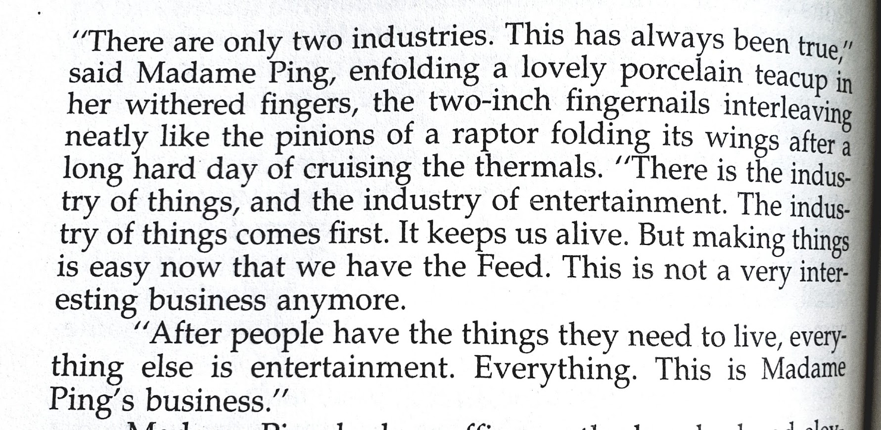 This is the type of science fiction book I have not seen enough of: a realistic vision of Earth in the next century. Most science fiction on earth is set in the nearer future of this century, which is naturally easier to anticipate and imagine (such as Stephenson’s earlier book Snow Crash). Most far-future science fiction is set off-earth in space and/or on alien planets, which is also easier to imagine because very little realistic prognostication is required—it’s more akin to fantasy. Obviously it is impossible to know what the future will actually be like (near or far) but The Diamond Age seems like a realistic vision of a possible future.